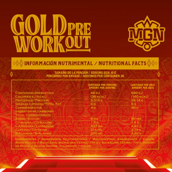 Gold Pre Workout está diseñado para dar a los deportistas el impulso explosivo que necesitan antes de cada entrenamiento. Desarrollado por científicos en laboratorios especializados, su fórmula garantiza una activación rápida de la energía y mejora de la resistencia desde el primer momento. Inspirado en la fuerza y el conocimiento de los antiguos guerreros, este suplemento impulsa a los atletas a superar sus límites. Gold Pre Workout activa tu cuerpo y mente para alcanzar un rendimiento máximo y asegura una experiencia de entrenamiento más intensa y efectiva.